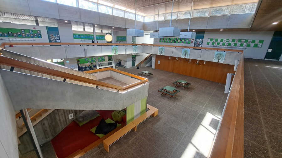 Arbeitsplätze in der Aula und die Leseoase unter der Treppe: